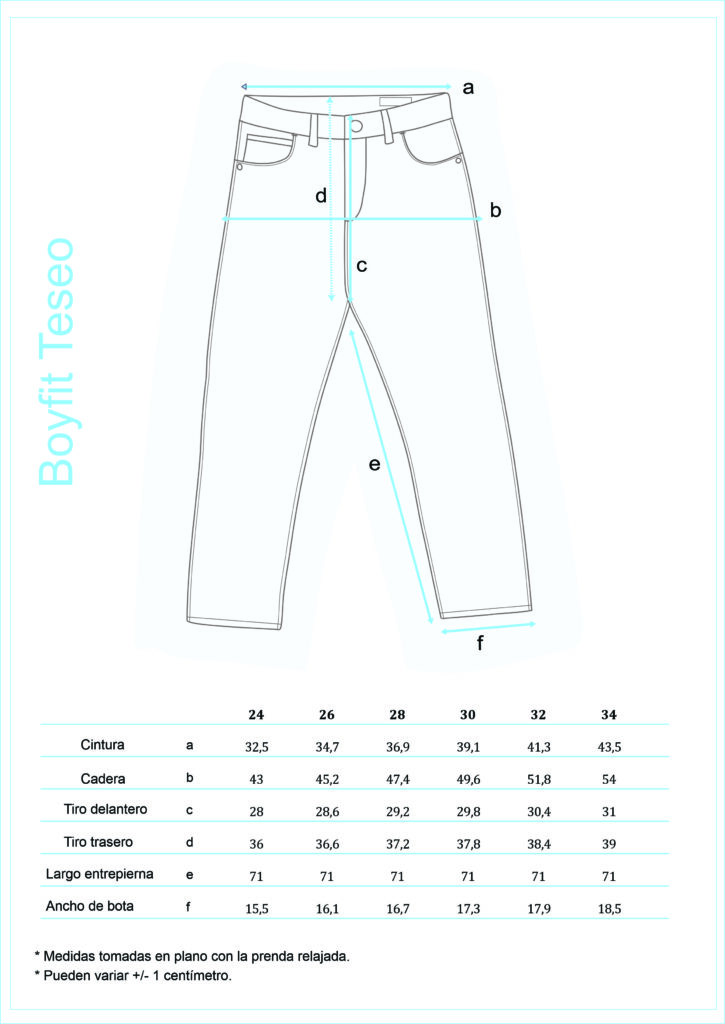 TESEO tiene 5 bolsillos, es tiro medio, y ajusta en cadera y muslos, con leve holgura en piernas.