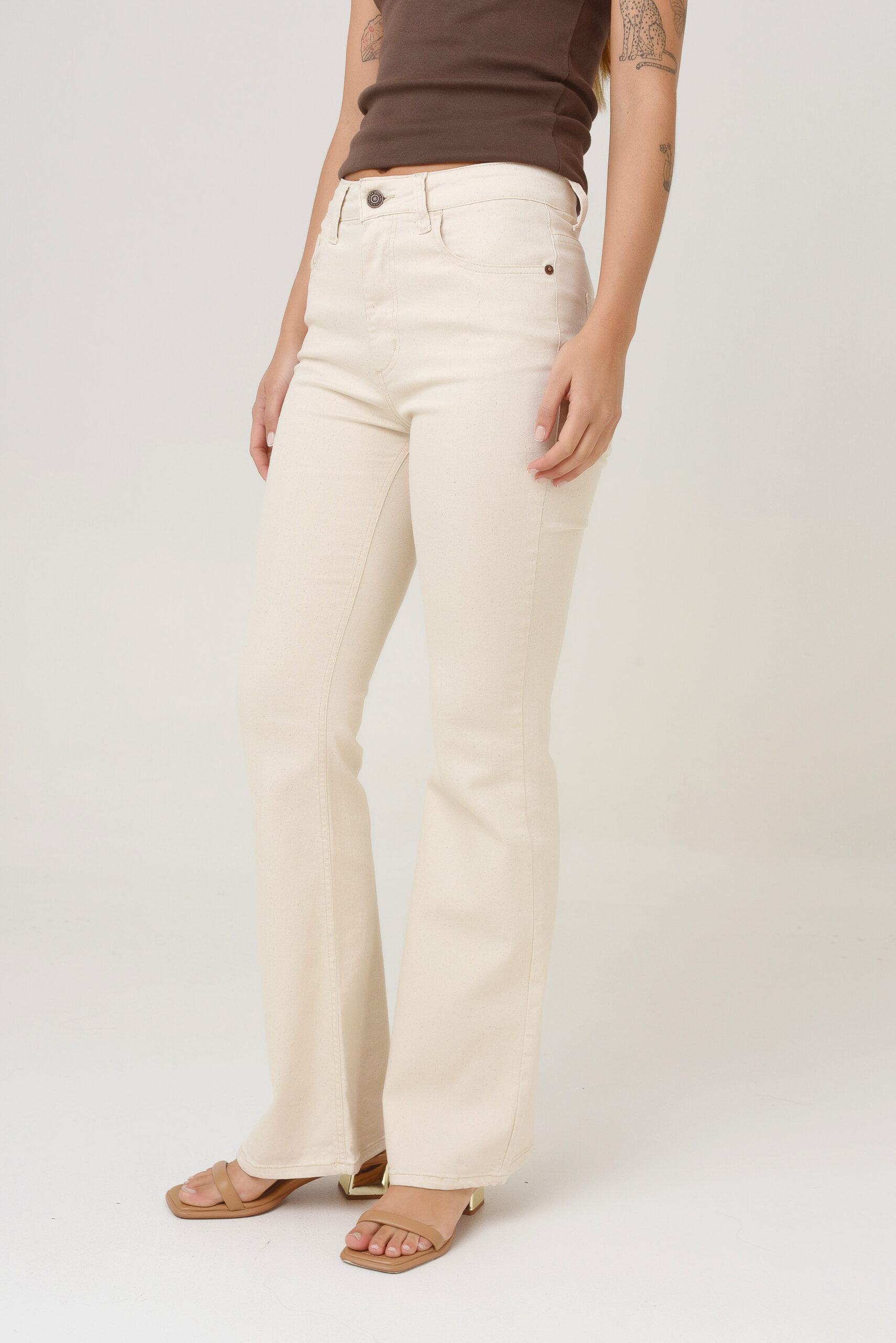 Su pierna acampana sutilmente desde pantorrilla.