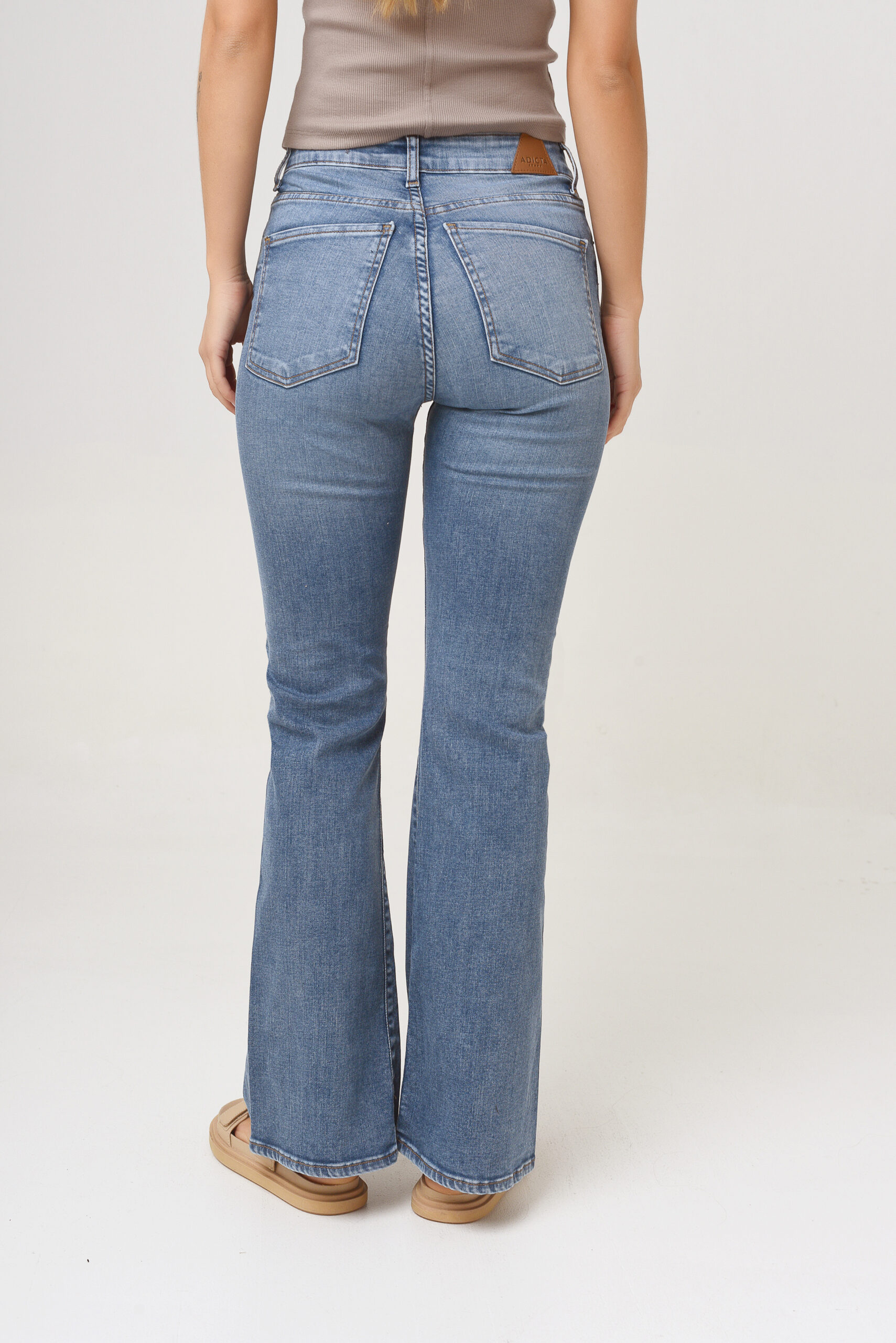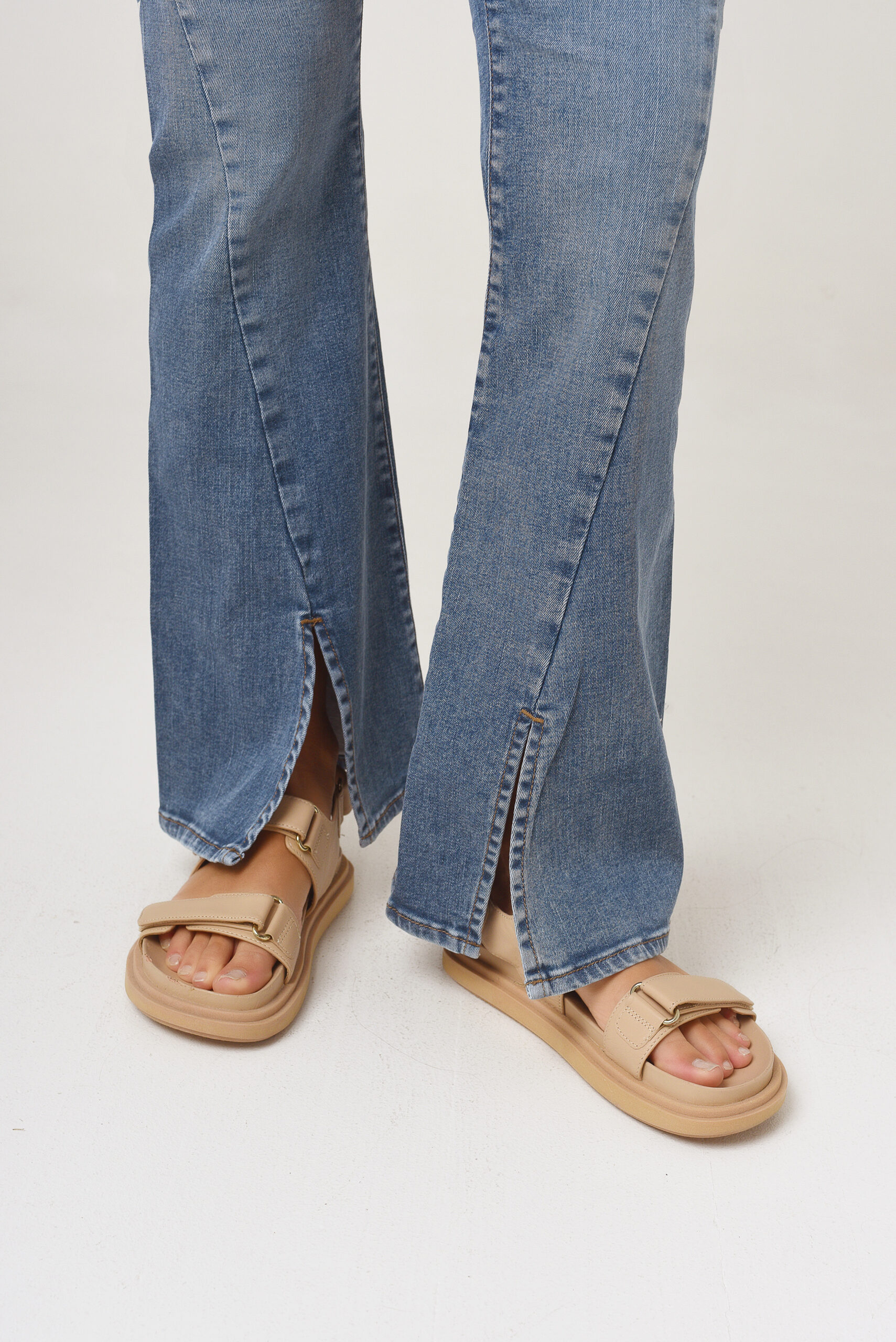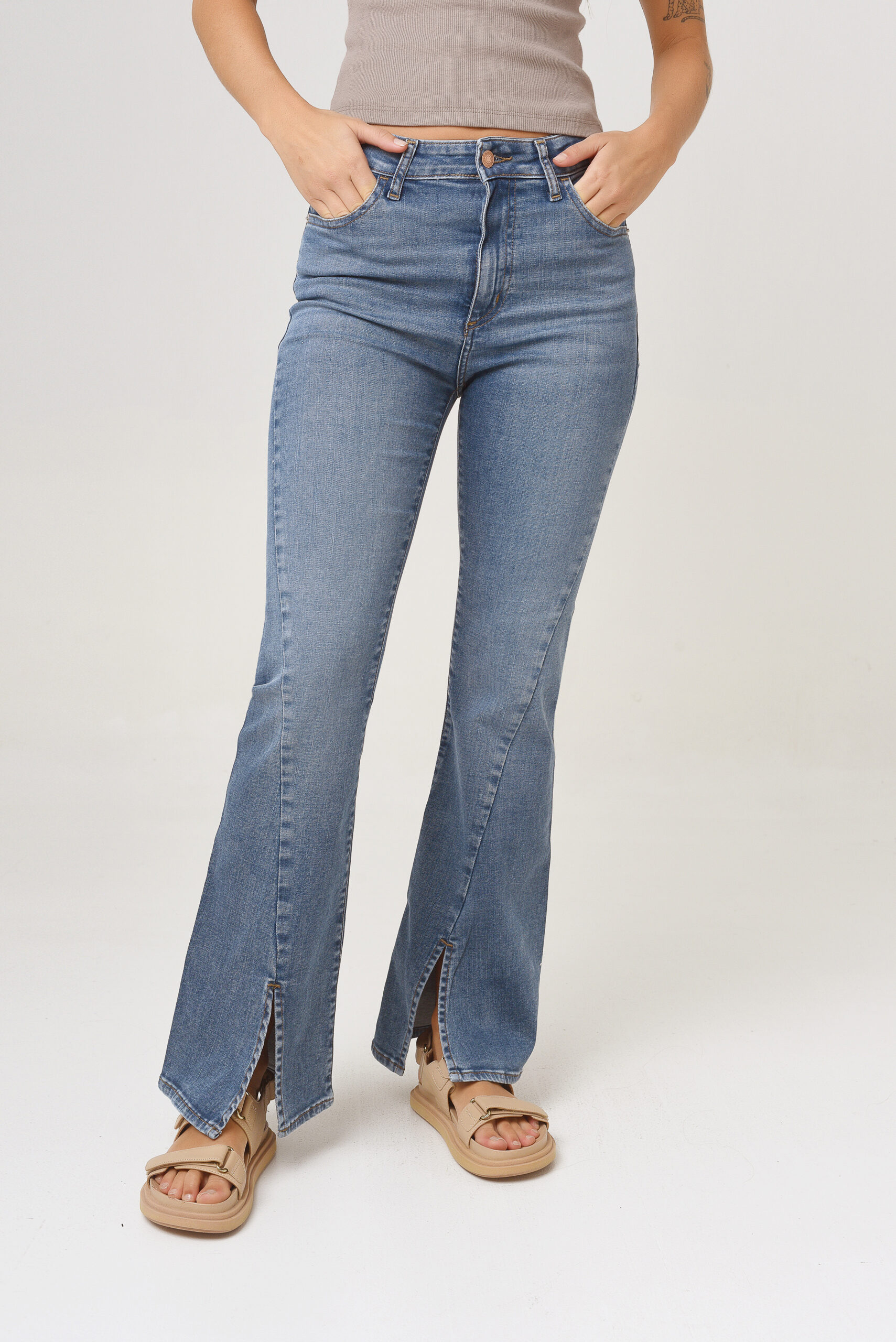 Su pierna acampana sutilmente desde pantorilla, sin apretar.