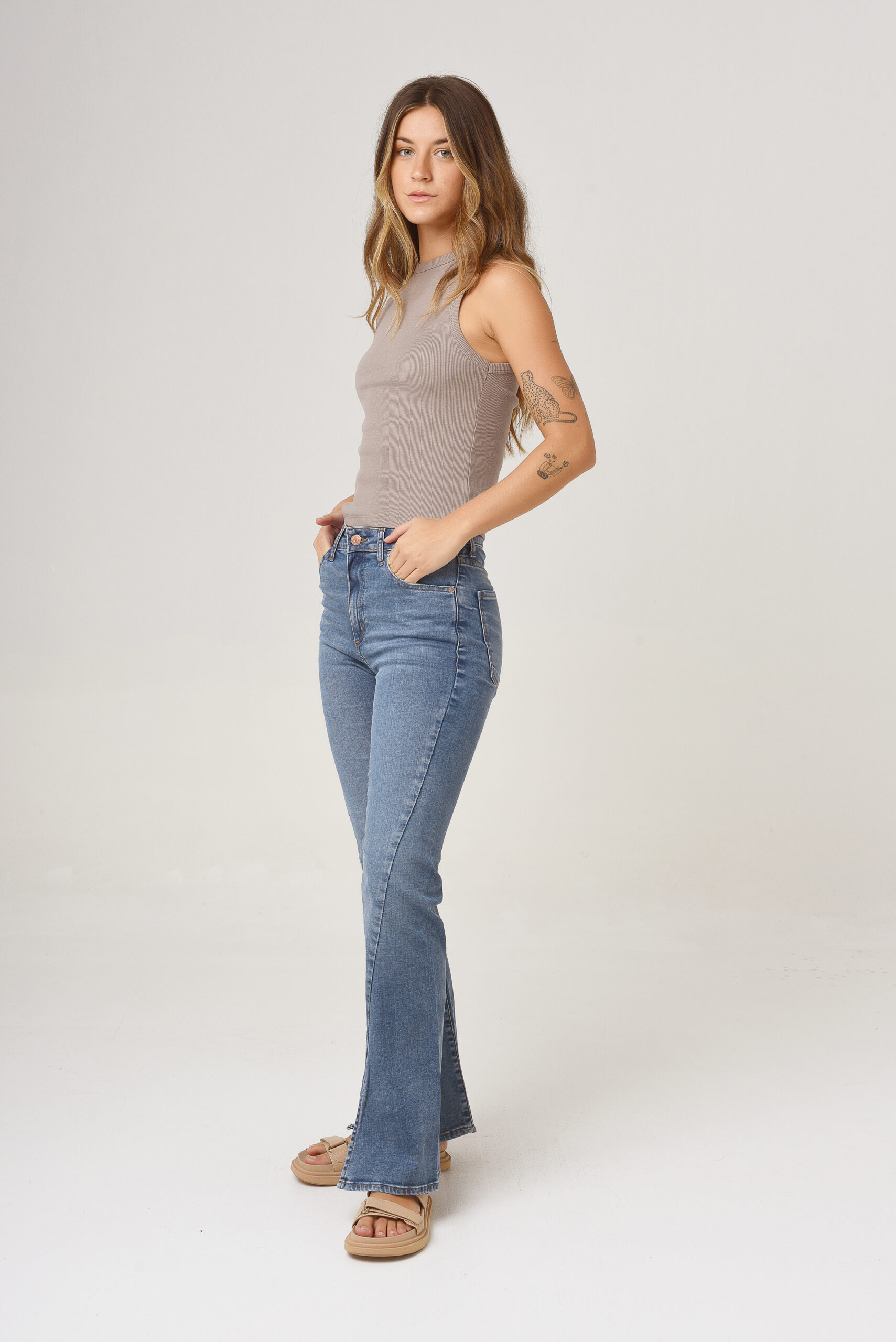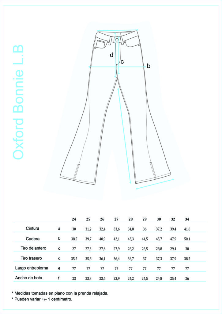 BONNIE L.B, tiene 5 bolsillos, tiro alto, y ajusta en cintura, cadera y muslos.