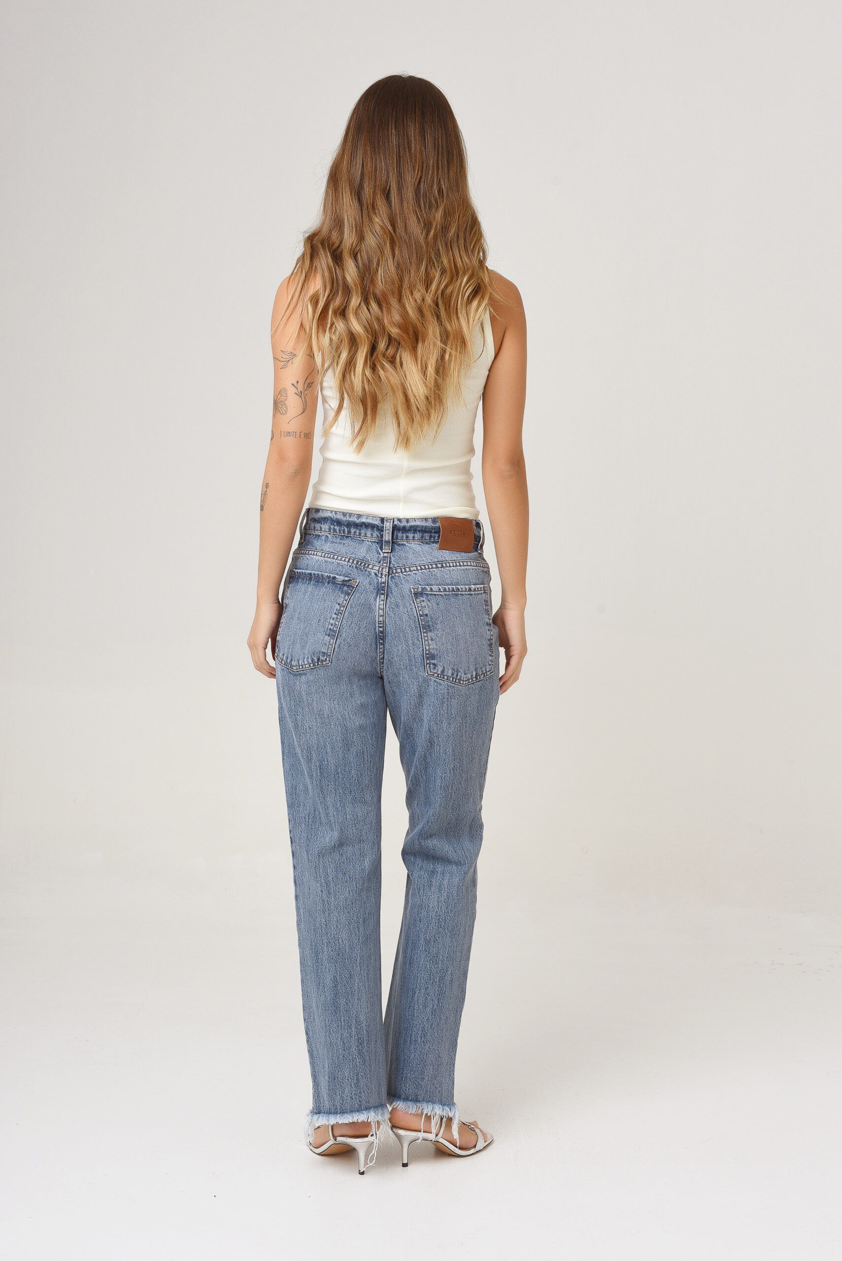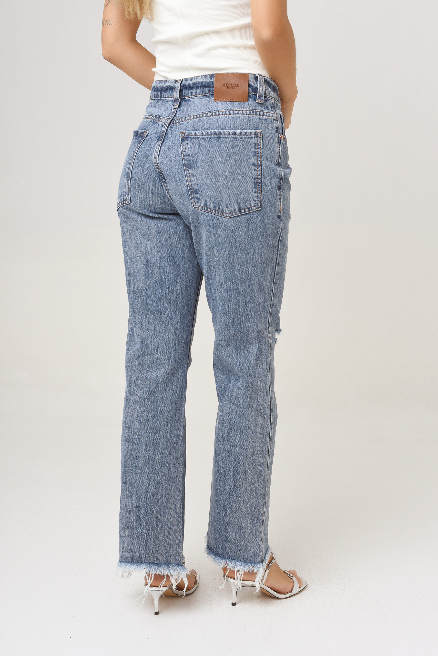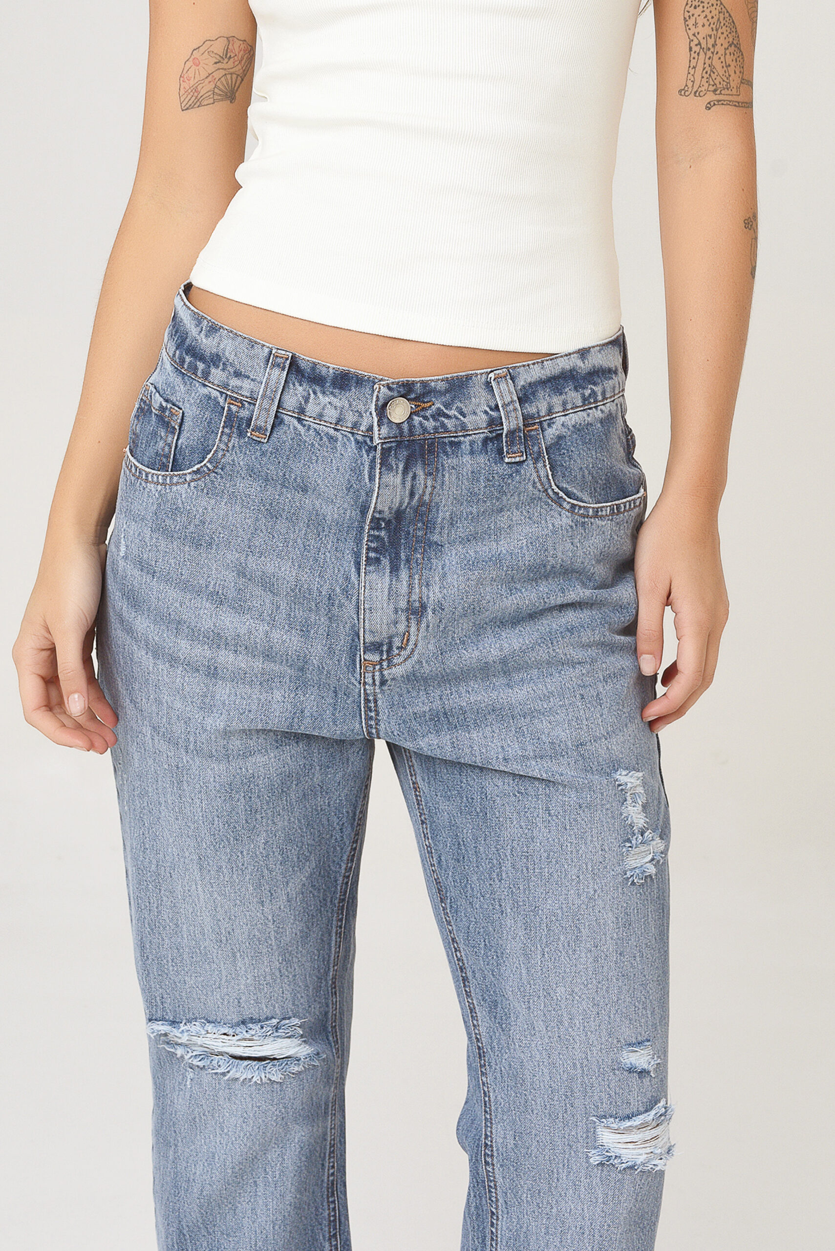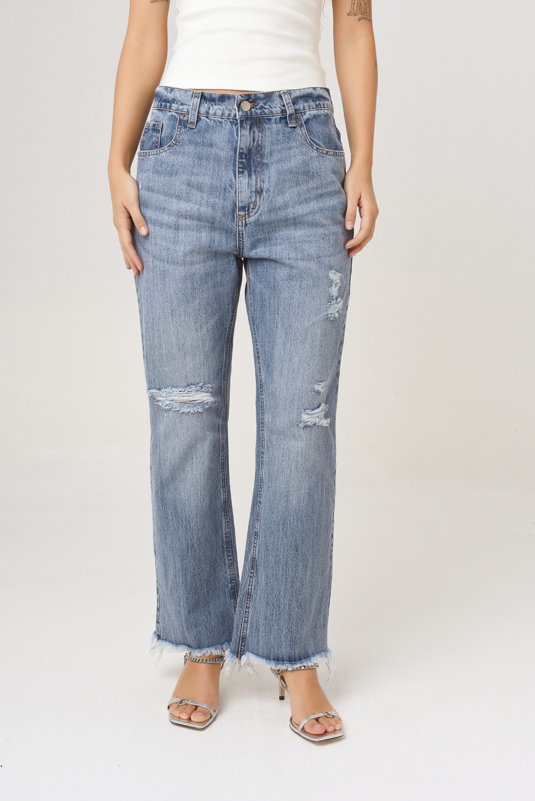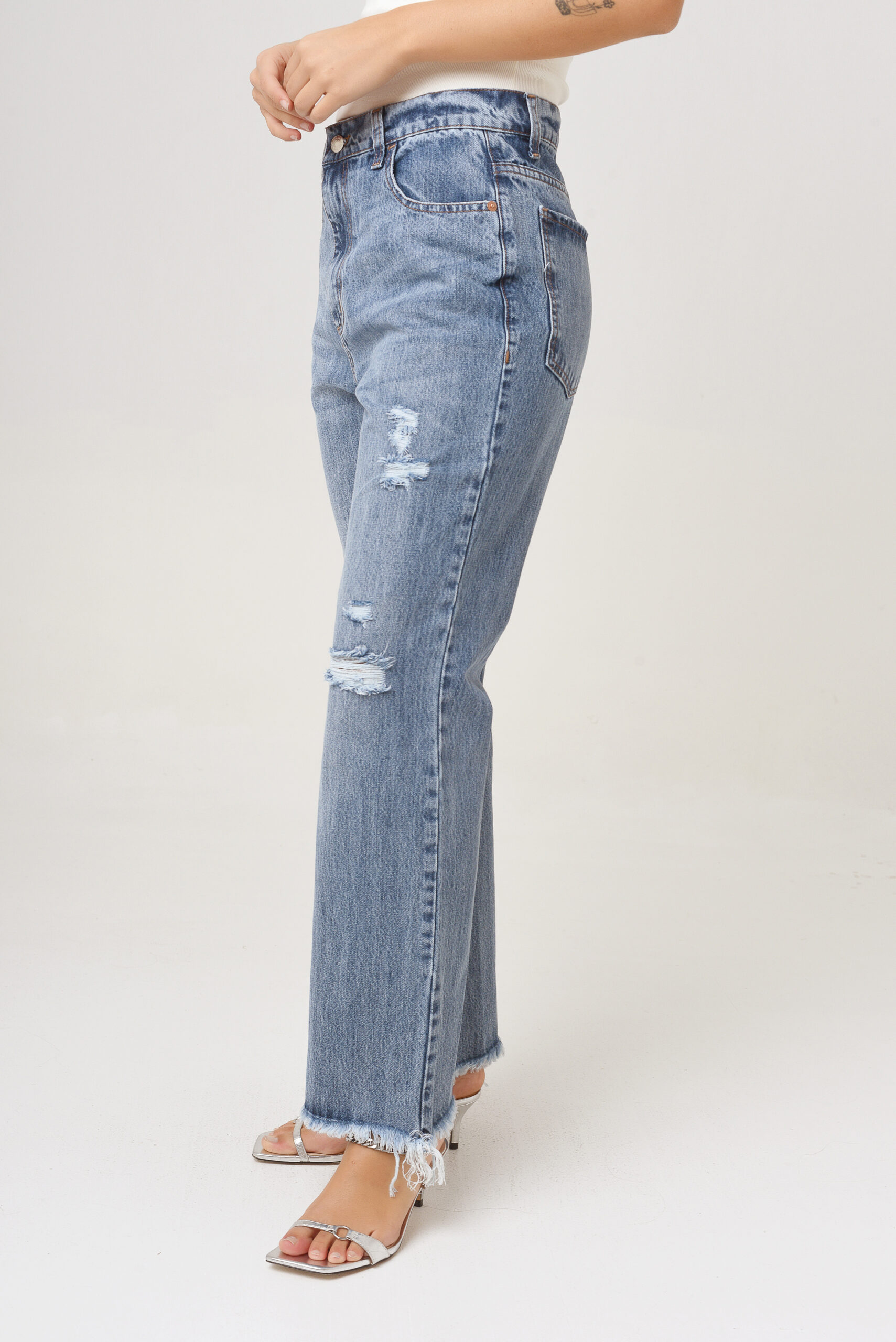 Lavado de base azul clara con bigotes, y desgaste completo. Tiene frizados y roturas. Su botamanga es desflecada.