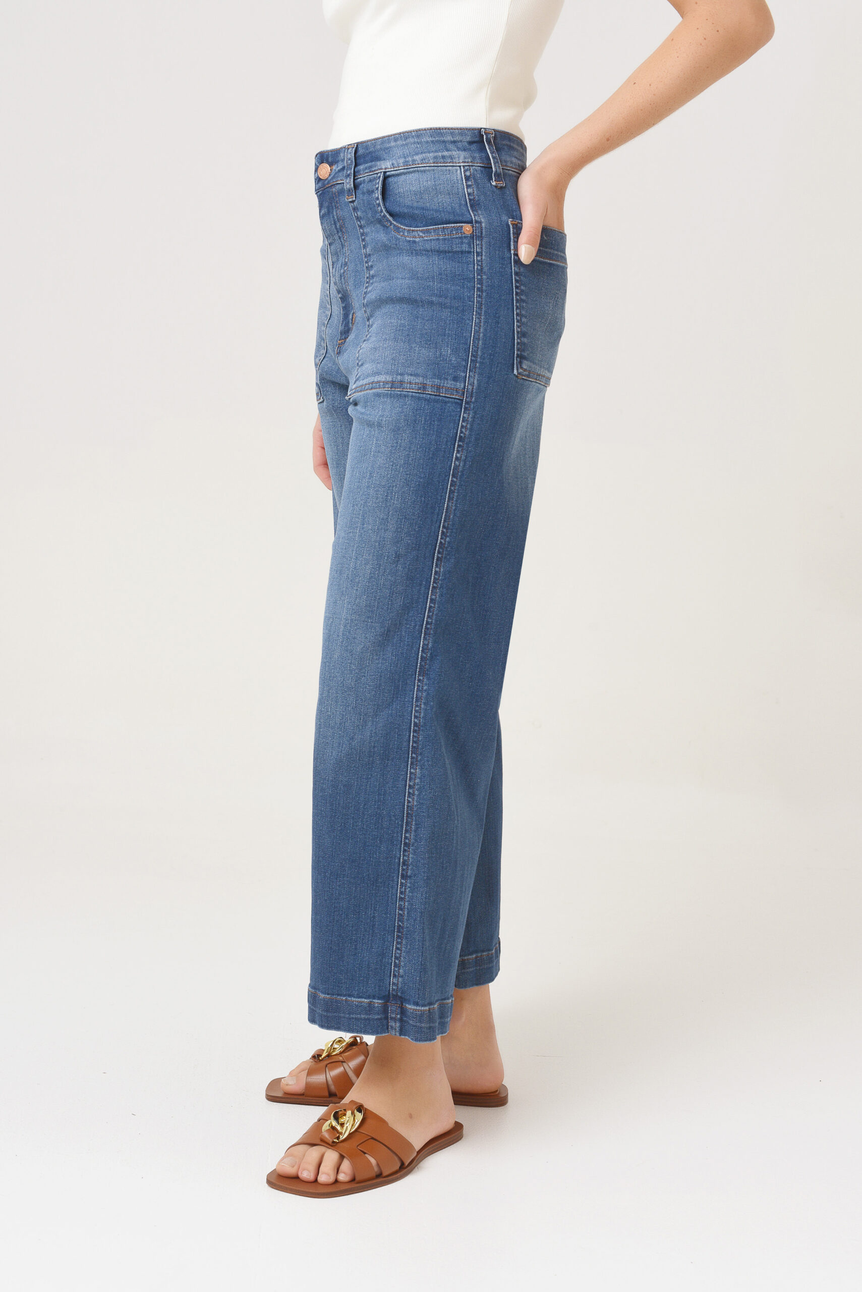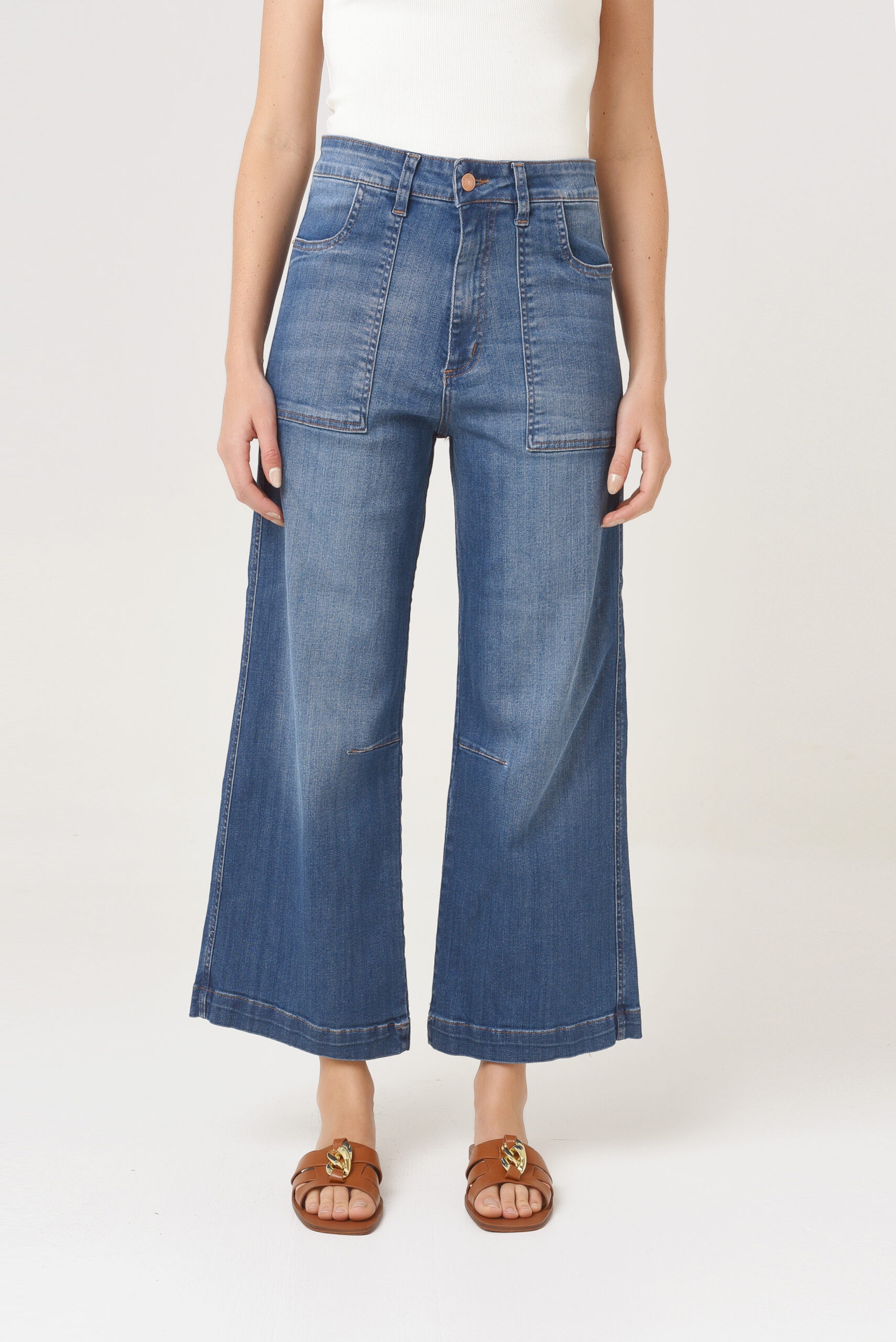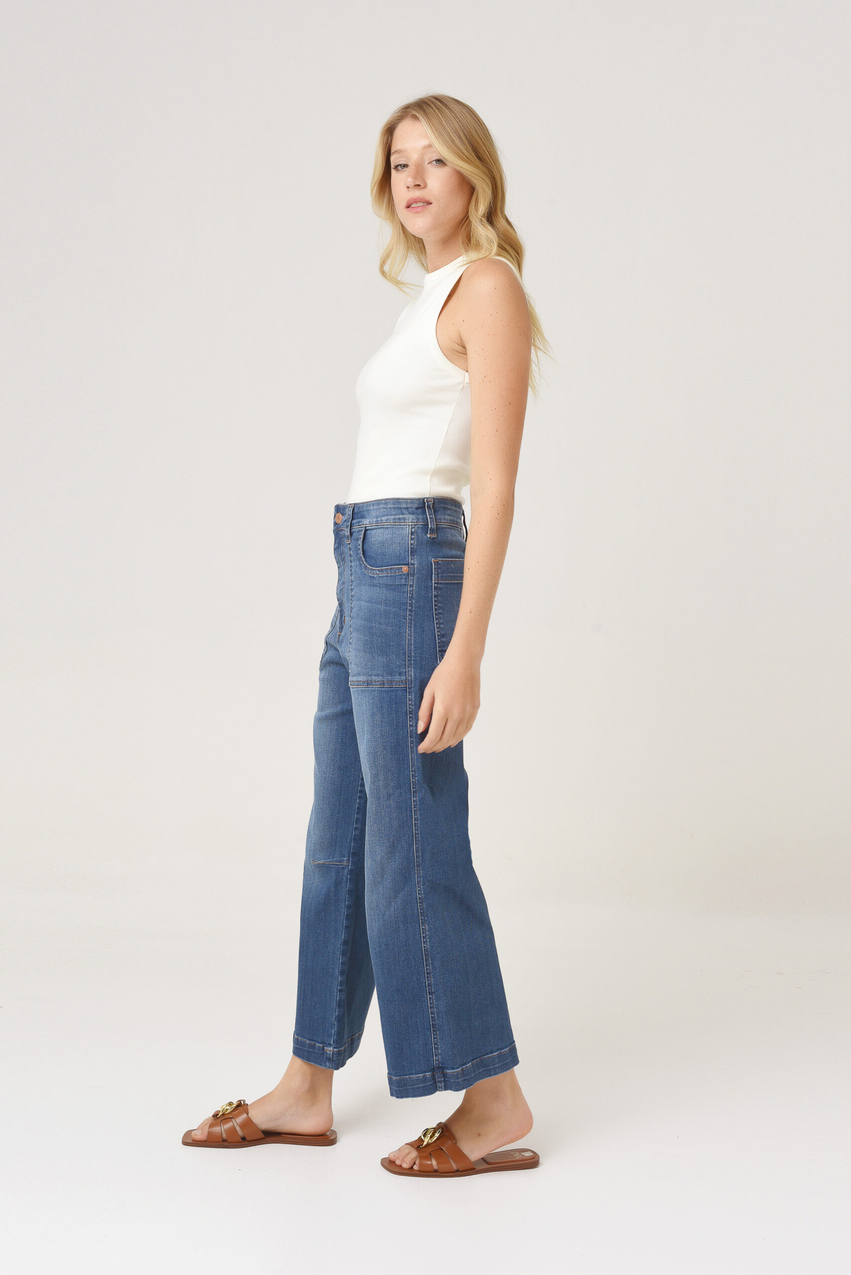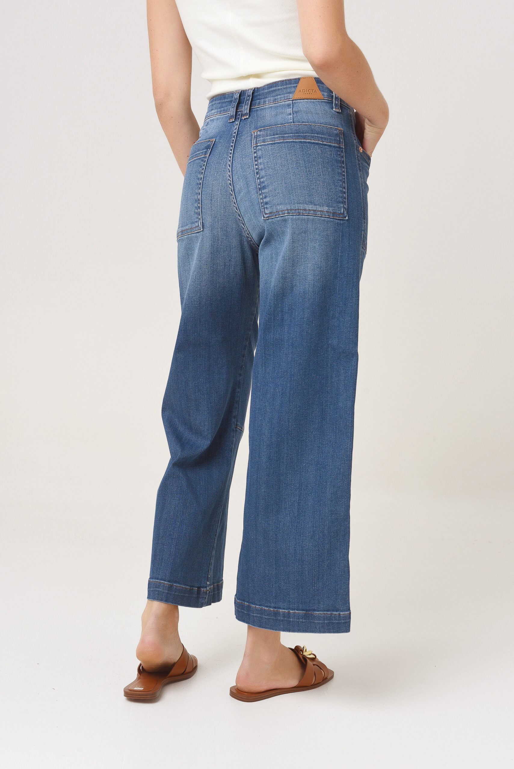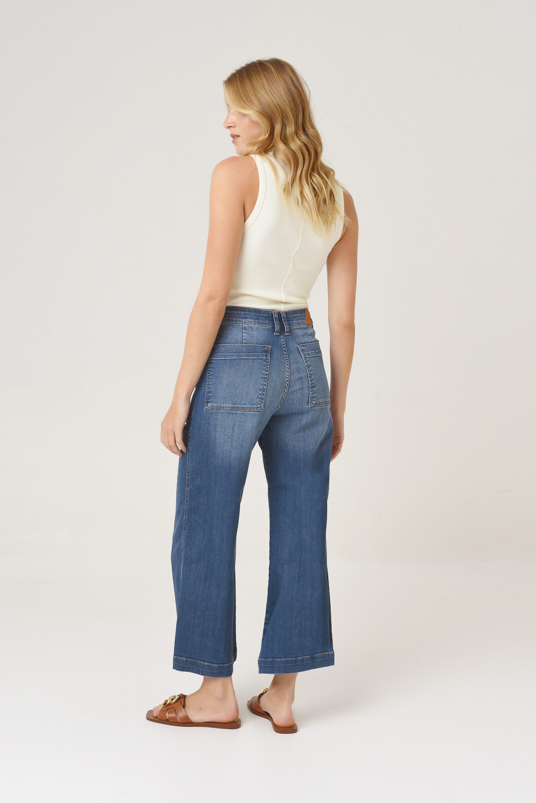 Su pierna es ancha de muslo a bota, su largo es crop y su ruedo es ancho.