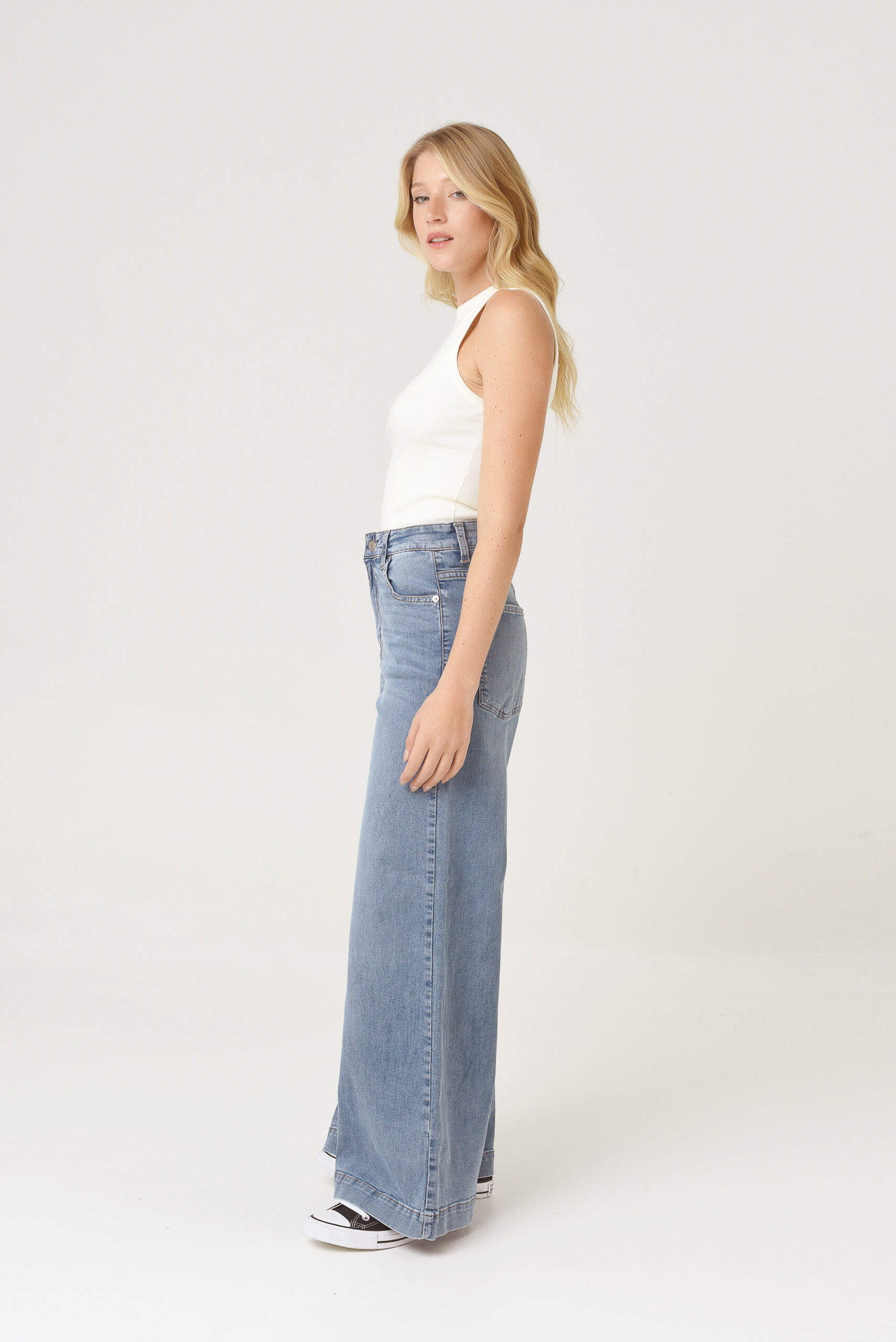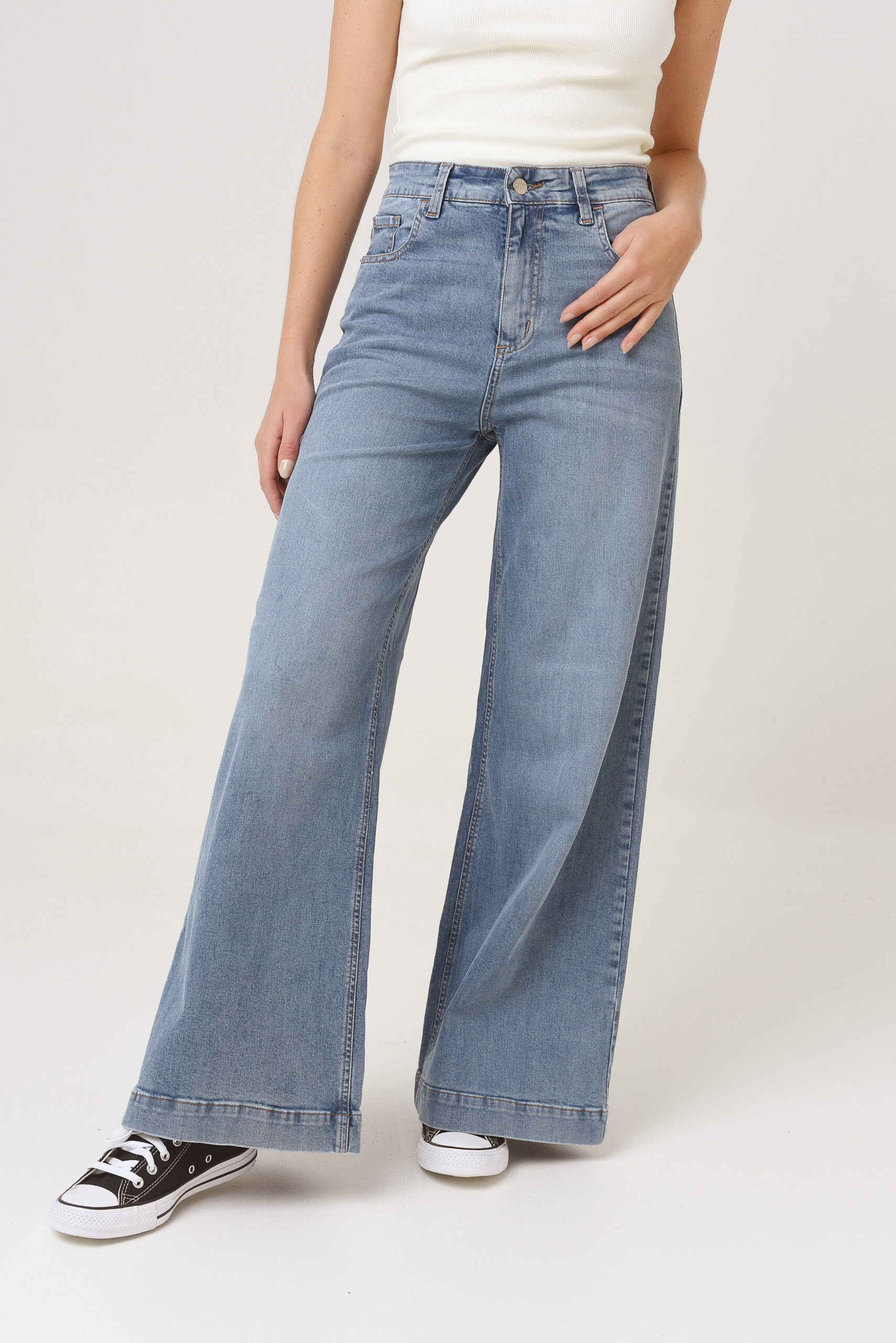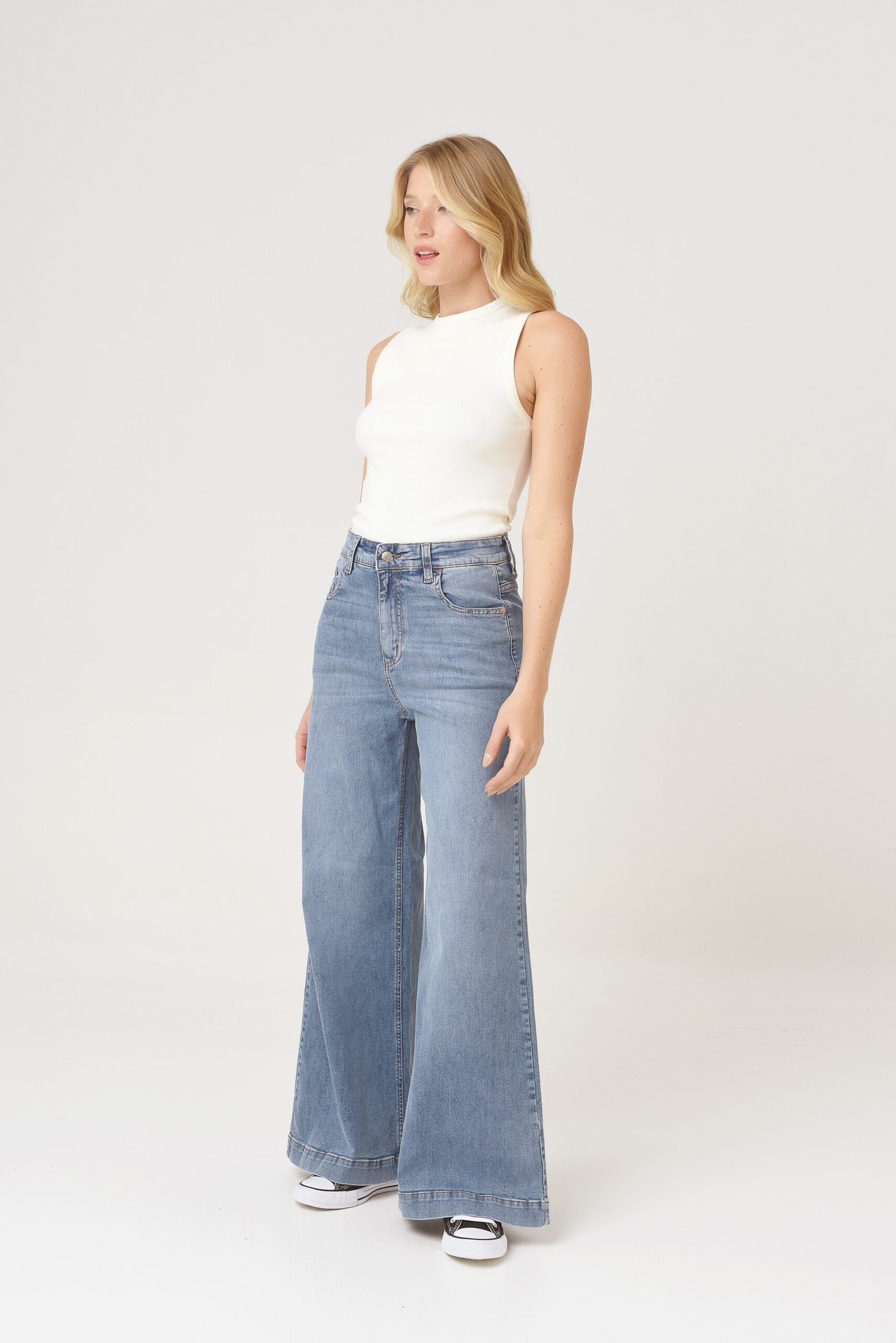 Su tiro es alto, su pierna es ancha ampliandose de muslo a bota, su largo es full y su ruedo es ancho.
