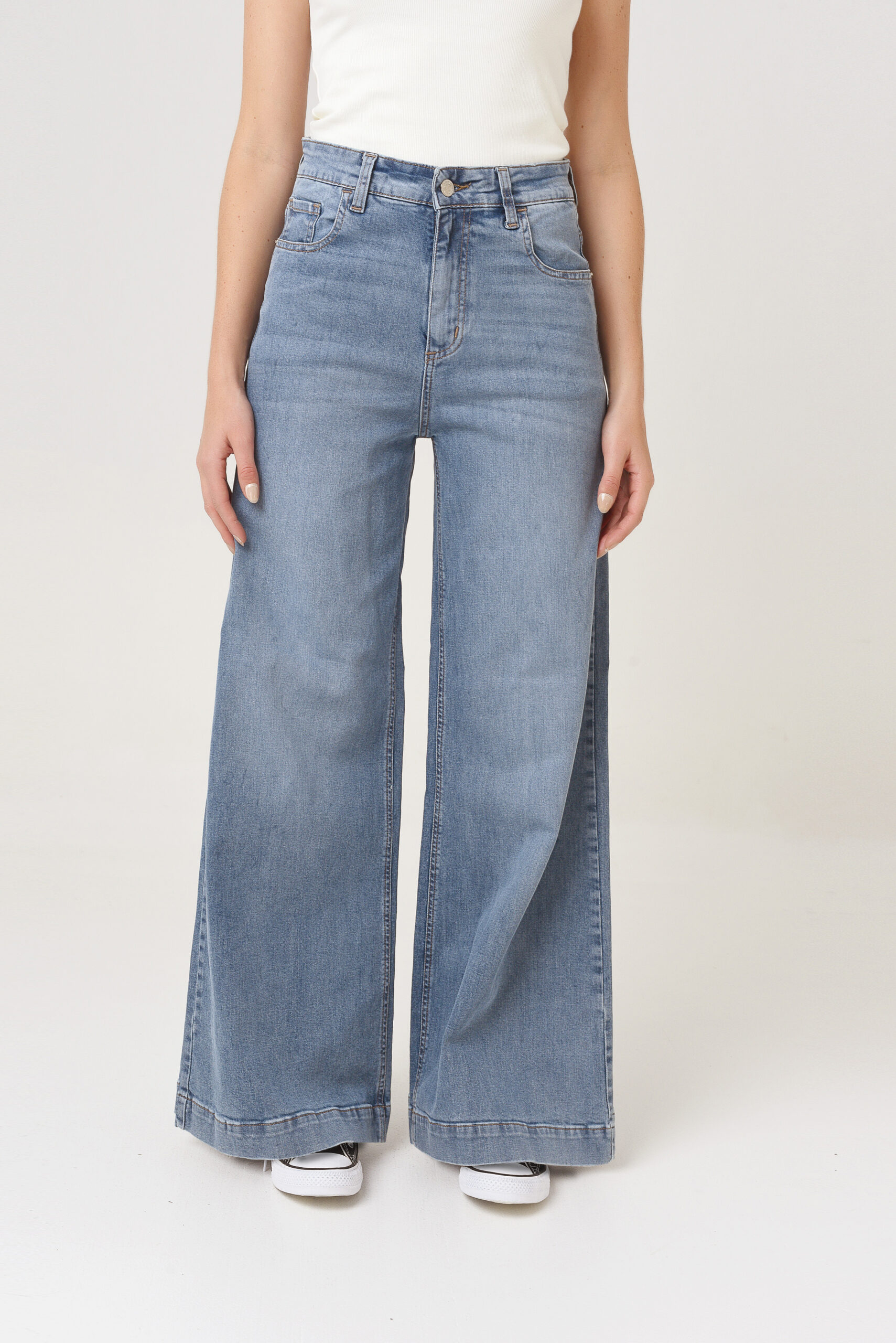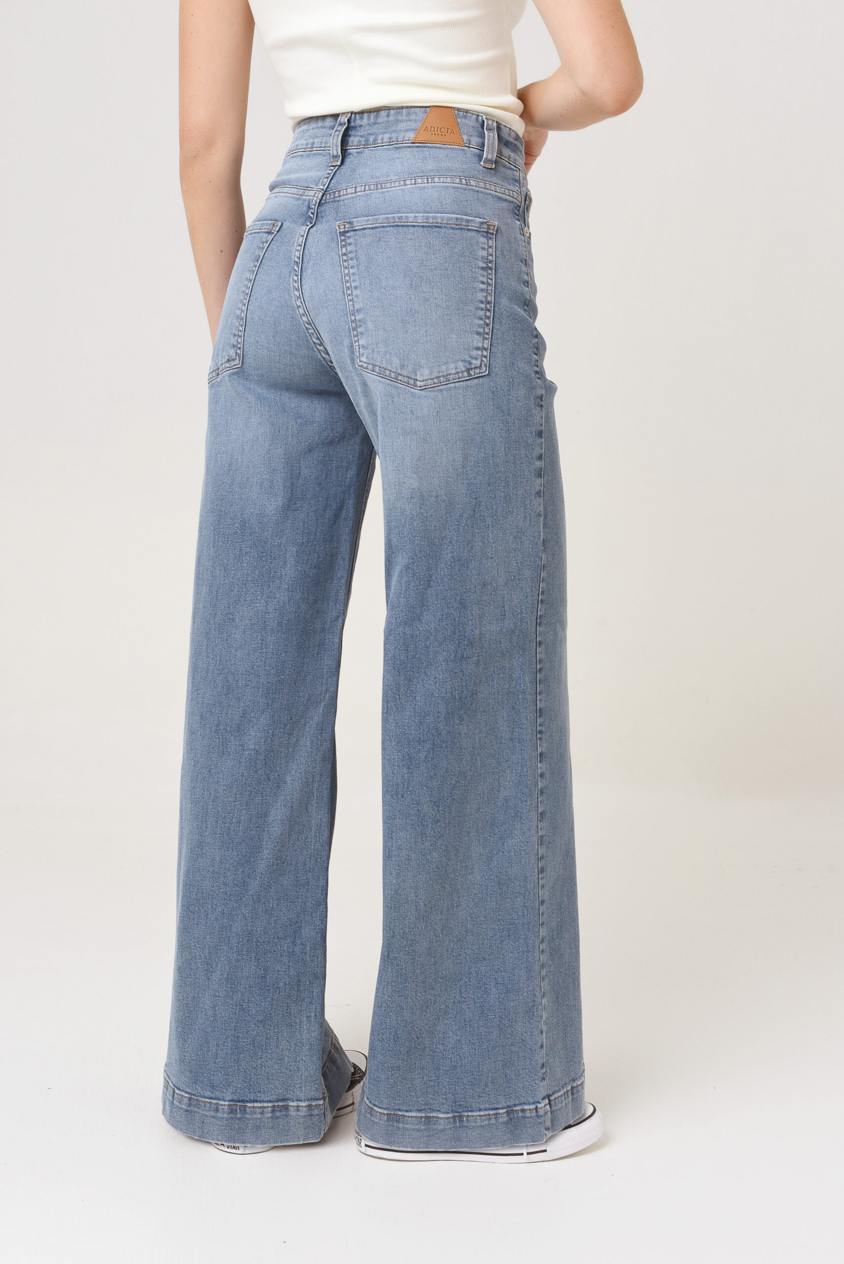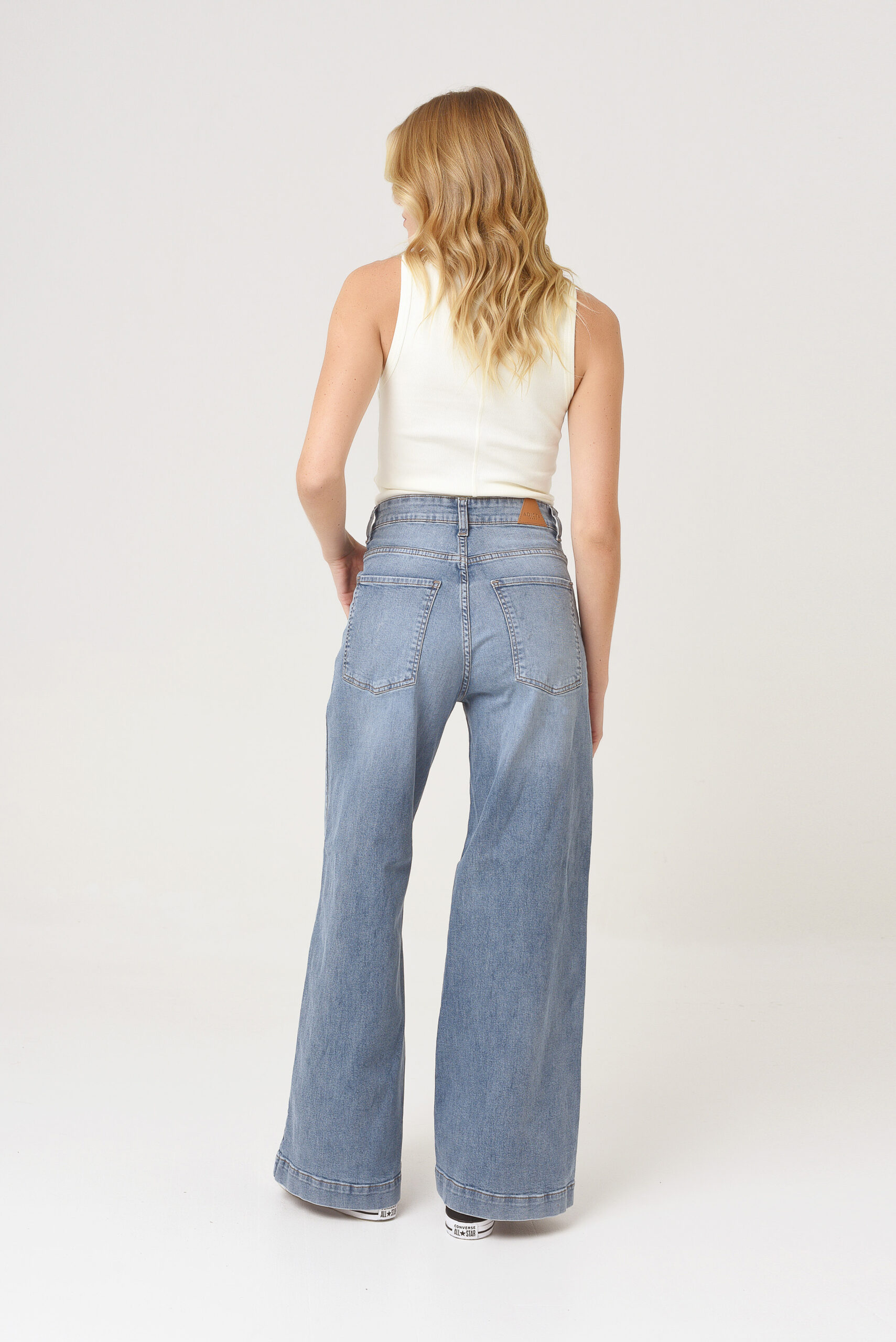 Su tiro es alto, su pierna es ancha ampliandose de muslo a bota, su largo es full y su ruedo es ancho.